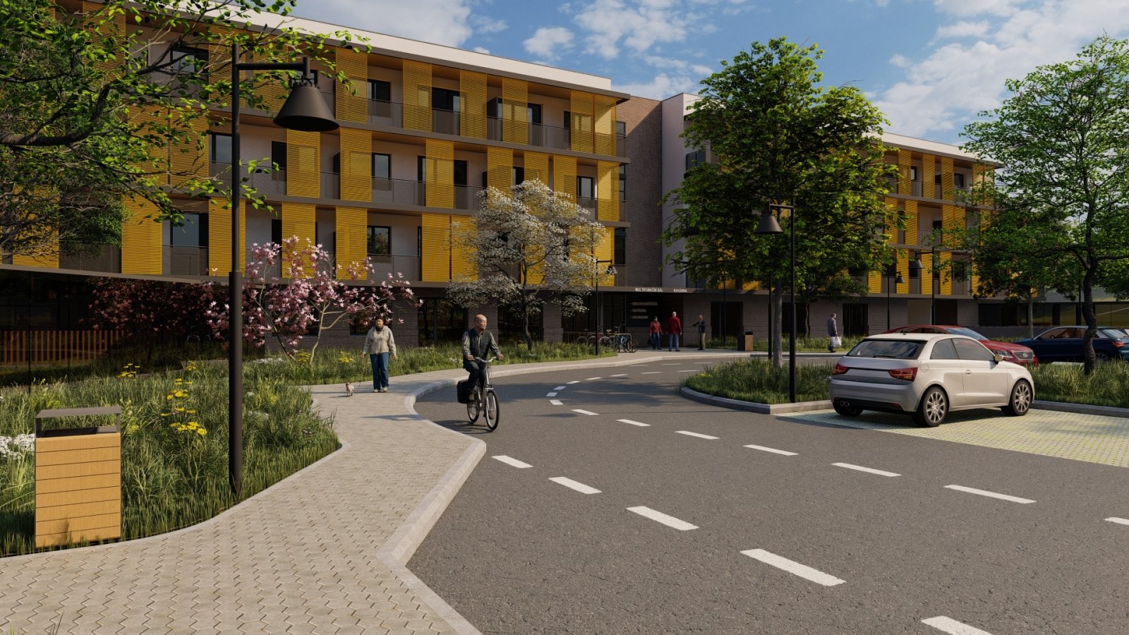 parkováním, a dále i s prostory pro společenský kontakt. Jednotlivé
