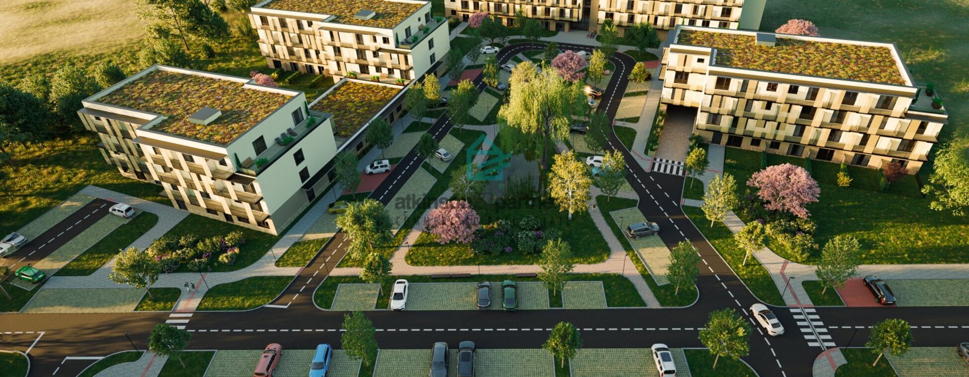 relaxační zahrada se stromy a květinami ve vnitrobloku. Bytové jednotky
